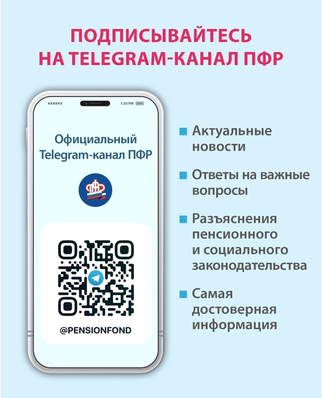 Получайте информацию по самым актуальным вопросам социальной поддержки населения, об услугах и сервисах, оказываемых Пенсионным фондом России, в официальном телеграм-канале t.me/pensionfond